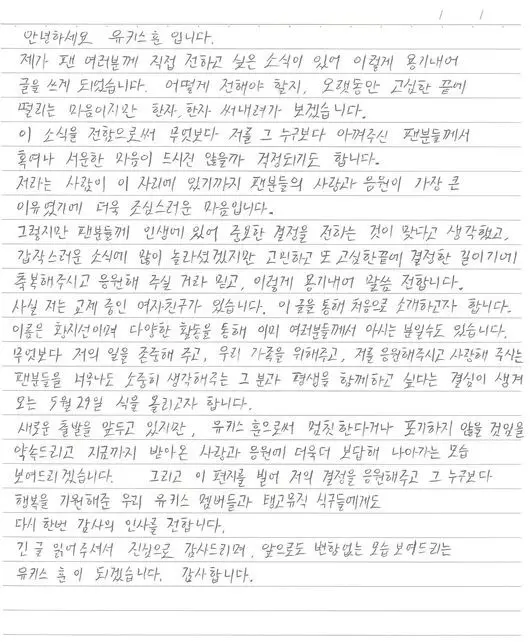 ฮุนได้ออกจดหมายที่เขียนด้วยลายมือผ่านต้นสังกัดของเขาเพื่อประกาศให้แฟนๆ ทราบเกี่ยวกับงานแต่งงานของเขา โดยกล่าวว่า “ผมมีข่าวอยากจะบอกแฟนๆ ดังนั้นผมจึงรวบรวมความกล้าเพื่อเขียนสิ่งนี้” “ผมรู้สึกประหม่า แต่จะพยายามเขียนมันด้วยตัวเอง ผมกังวลว่าแฟนๆ ที่ห่วงใยผมมากกว่าใครจะต้องผิดหวัง ผมจะระมัดระวังมากขึ้น เพราะความรักและการสนับสนุนจากแฟน ๆ เป็นเหตุผลที่ใหญ่ที่สุดสำหรับผม” เขากล่าว