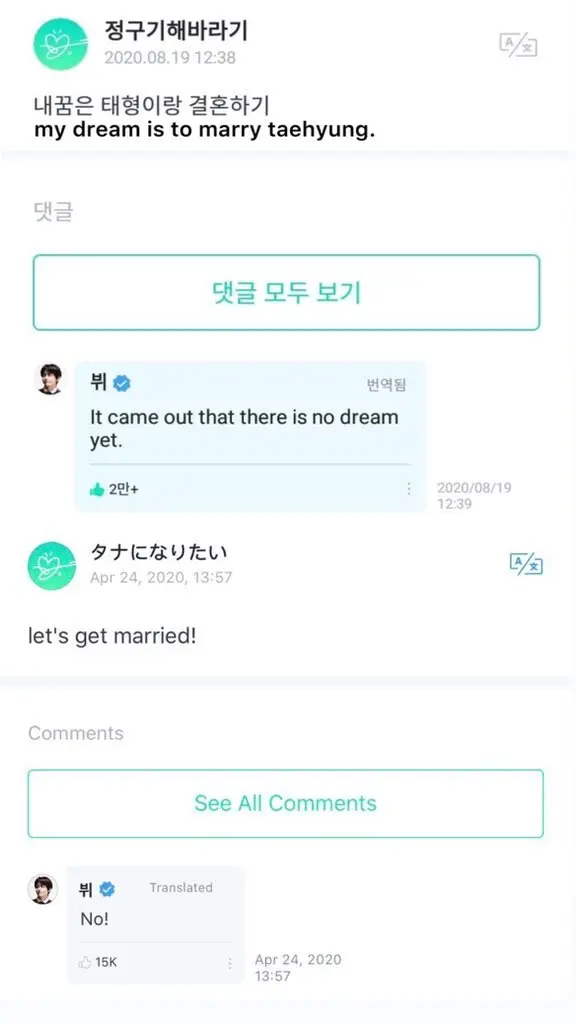 ในระหว่างการออกอากาศ แฟนคนหนึ่งได้แสดงความคิดเห็นว่า “ได้โปรดบอกแทฮยอง (วี) ให้แต่งงานกับฉัน” ทว่าในขณะที่สมาชิกส่วนใหญ่อาจหัวเราะหรือปฏิเสธ แต่จินพูดติดตลกว่า “อ่า แทฮยองกำลังจะแต่งงาน ยินดีด้วย.”