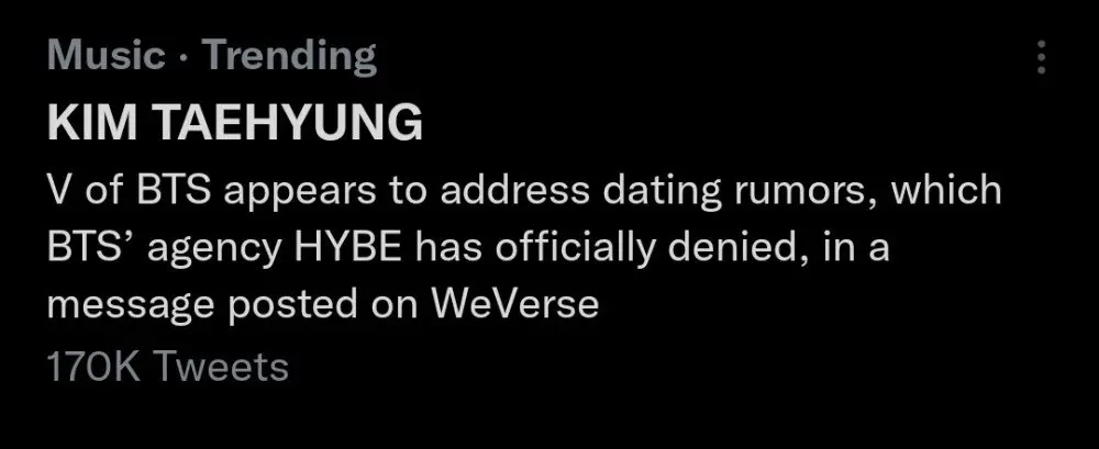 เมื่อเร็วๆ นี้ วี BTS ได้ออกมาแสดงความรู้สึกไม่พอใจต่อข่าวลือที่ไม่มีมูลความจริงที่แพร่กระจายไปเมื่อเร็วๆนี้ ผ่านทางชุมชนแฟนคลับ Weverse