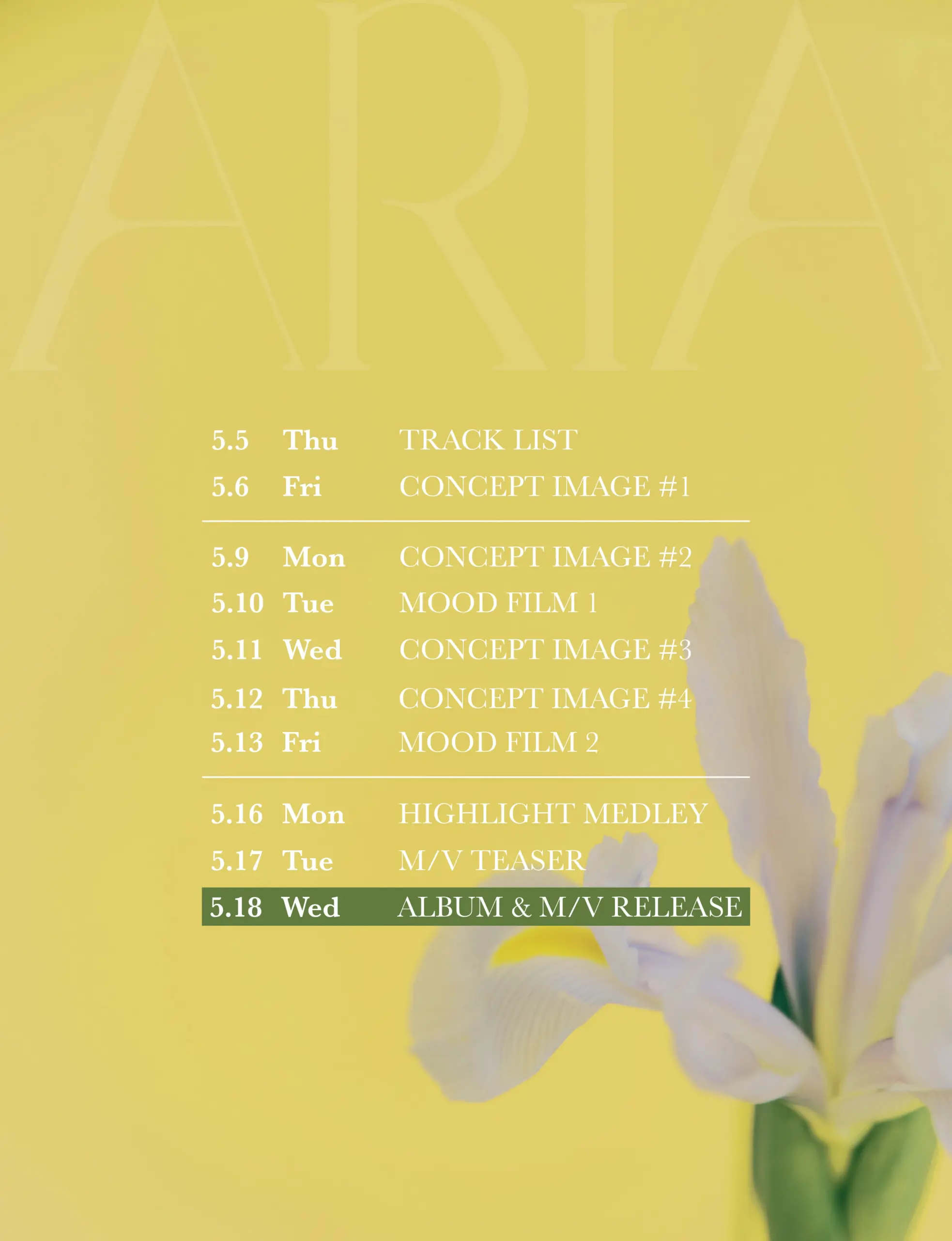 และเมื่อวันที่ 4 พฤษภาคม เวลาเที่ยงคืนเกาหลี เยรินยืนยันวันเดบิวต์โซโล่ของเธอด้วยตารางทีเซอร์สำหรับมินิอัลบั้มแรก “ARIA”!
