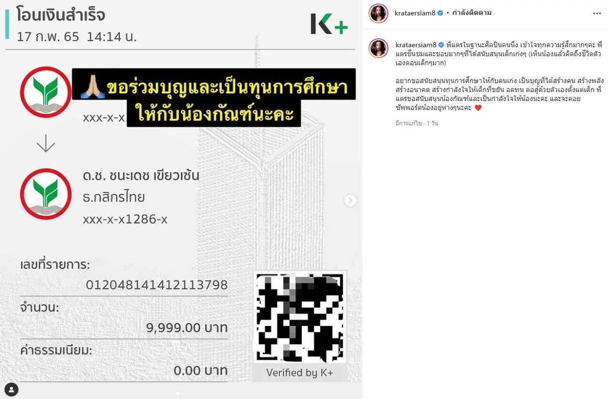 อยากขอสนับสนุนทุนการศึกษาให้กับคนเก่ง เป็นบุญที่ได้สร้างคน สร้างพลัง สร้างอนาคต สร้างกำลังใจให้เด็กที่ขยัน อดทน ต่อสู้ด้วยตัวเองตั้งแต่เด็ก พี่แตรขอสนับสนุนน้องกัณฑ์และเป็นกำลังใจให้น้องนะคะ และจะคอยซัพพอร์ตน้องอยู่ห่าง ๆ นะคะ’