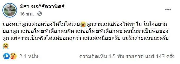 นอกจากนี้เอ๋ มิรา ยังได้โพสต์ข้อความหลังได้รับหมายศาลว่า มองหน้าลูกแล้วอดร้องไห้ไม่ได้เลย