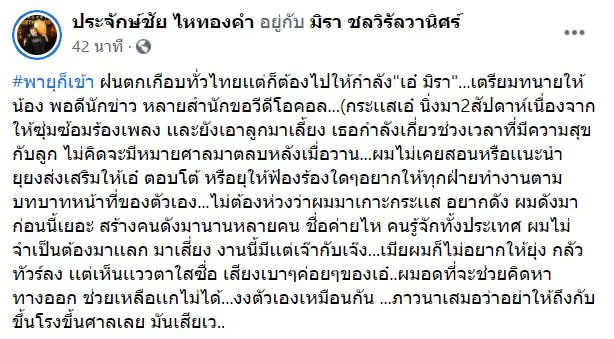ล่าสุดวันนี้ (25 กันยายน 2564) เจ้าตัวร่ายยาวผ่านเฟซบุ๊กว่า พายุก็เข้า ฝนตกเกือบทั่วไทยเเต่ก็ต้องไปให้กำลัง”เอ๋ มิรา”…เตรียมทนายให้น้อง พอดีนักข่าว หลายสำนักขอวีดีโอคอล…(กระเเสเอ๋ นิ่งมา2สัปดาห์เนื่องจากให้ซุ่มซ้อมร้องเพลง เเละยังเอาลูกมาเลี้ยง เธอกำลังเกี่ยวช่วงเวลาที่มีความสุขกับลูก ไม่คิดจะมีหมายศาลมาตลบหลังเมื่อวาน…ผมไม่เคยสอนหรือเเนะนำ ยุยงส่งเสริมให้เอ๋ ตอบโต้ หรือยุให้ฟ้องร้องใดๆอยากให้ทุกฝ่ายทำงานตามบทบาทหน้าที่ของตัวเอง…ไม่ต้องห่วงว่าผมมาเกาะกระเเส อยากดัง ผมดังมาก่อนนี้เยอะ สร้างคนดังมานานหลายคน ชื่อค่ายไห คนรู้จักทั้งประเทศ ผมไม่จำเป็นต้องมาเเลก มาเสี่ยง งานนี้มีเเต่เจ๊ากับเจ๊ง…เมียผมก็ไม่อยากให้ยุ่ง กลัวทัวร์ลง เเต่เห็นเเววตาใสซื่อ เสียงเบาๆค่อยๆของเอ๋..ผมอดที่จะช่วยคิดหาทางออก ช่วยเหลือเเกไม่ได้…งงตัวเองเหมือนกัน …ภาวนาเสมอว่าอย่าให้ถึงกับขึ้นโรงขึ้นศาลเลย มันเสียเว.. ทันทีที่โพสต์ออกไปก็มีแฟนเพลงเข้ามาร่วมให้กำลังใจมากมาย