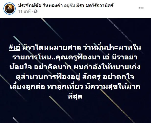 เมื่อวานที่ผ่านมา (24 กันยายน 2564) นายห้างประจักษ์ชัย ไหทองคำ โพสต์ข้อความว่า เอ๋ มิราโดนหมายศาล ว่าหมิ่นประมาทในรายการโหน..คุณครูฟ้องมา เอ๋ มิราอย่าน้อยใจ อย่าคิดมาก ผมกำลังให้ทนายเก่งดูสำนวนการฟ้องอยู่ สักครู่ อย่าตกใจ เลี้ยงลูกต่อ พาลูกเที่ยว มีความสุขให้มากที่สุด