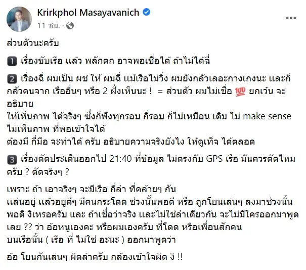 เรื่องตัดประเด็นออกไป 21:40 ที่ข้อมูล ไม่ตรงกับ GPS เรือ มันควรตัดไหมครับ ? ตัดจริงๆ ?เพราะ ถ้า เอาจริงๆ จะมีเรือ กี่ลำ ที่คล้ายๆ กัน เเล่นอยู่ เเล้วอยู่ดีๆ มีคนกระโดด ช่วงนั้นพอดี หรือ ถูกโยนเล่นๆ ลงมาช่วงนั้นพอดี งิเหรอครับ และ ถ้าเชื่อว่าจริง เเละไม่ใช่ลำเดียวกัน จะไม่มีใครออกมาพูดเลย ?? ว่า อ้อหนูเองคะ หรือผมเองครับ ที่โดด หรือเพื่อนสักคน บนเรือนั้น ( เรือ ที่ ไม่ใช่ อะนะ ) ออกมาพูดว่า อ้อ โยนกันเล่นๆ ผิดลำครับ กล้องเข้าใจผิด งิ !!