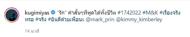 ล่าสุด ณเดชน์ คูกิมิยะ หนึ่งในผู้ที่ร่วมทริปนี้ได้ออกมาโพสต์ภาพคู่ หมาก-คิม พร้อมแคปชั่นว่า “รัก” คำสั้นๆที่พูดได้ทั้งชีวิต #1742022 #M&K #เรื่องจริงหรอ #จริง #ยินดีด้วยเพื่อนs @mark_prin @kimmy_kimberley ท่ามกลางแฟนคลับที่เข้ามากดไลค์ และ คอมเมนต์อย่างมากมาย และส่วนใหญ่นอกจากจะแสดงความยินดีกับคู่ หมาก-คิมแล้ว ยังมีหลายคอมเมนต์ที่บอกว่า รอคิวพี่แบร์อยู่นะคะ งานนี้ก็ต้องรอลุ้นกันว่าจะมีบิ๊กเซอร์ไพรส์ภายในปีนี้หรือไม่