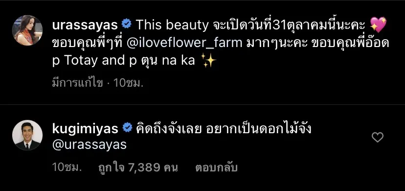 ล่าสุด ญาญ่า ได้มีการโพสต์ภาพขณะอยู่ในทุ่งดอกไม้สีแดง สุดงดงาม โดยมีแม่ปลา (แม่ของญาญ่า) อยู่ในเฟรมด้วย แต่งานนี้แฟนๆต่างต้องโฟกัสไปที่ คอมเมนต์จากหวานใจสุดหล่ออย่าง ณเดชน์ ที่ได้มีการเข้ามาคอมเมนต์ว่า “คิดถึงจังเลย อยากเป็นดอกไม้จัง” ทำเอาแฟนๆเขินแทนกันเป็นแถว