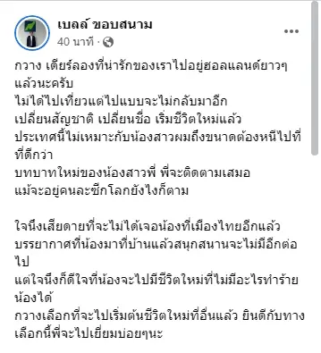 เบลล์ ขอบสนาม โพสต์เฟซบุ๊กถึง เดียร์ลอง ครีเอเตอร์ชื่อดัง เตรียมย้ายประเทศพร้อมเปลี่ยนสัญชาติ หลังเจอข่าวดราม่า เผย!เจ้าตัววางแผนมานานแล้ว