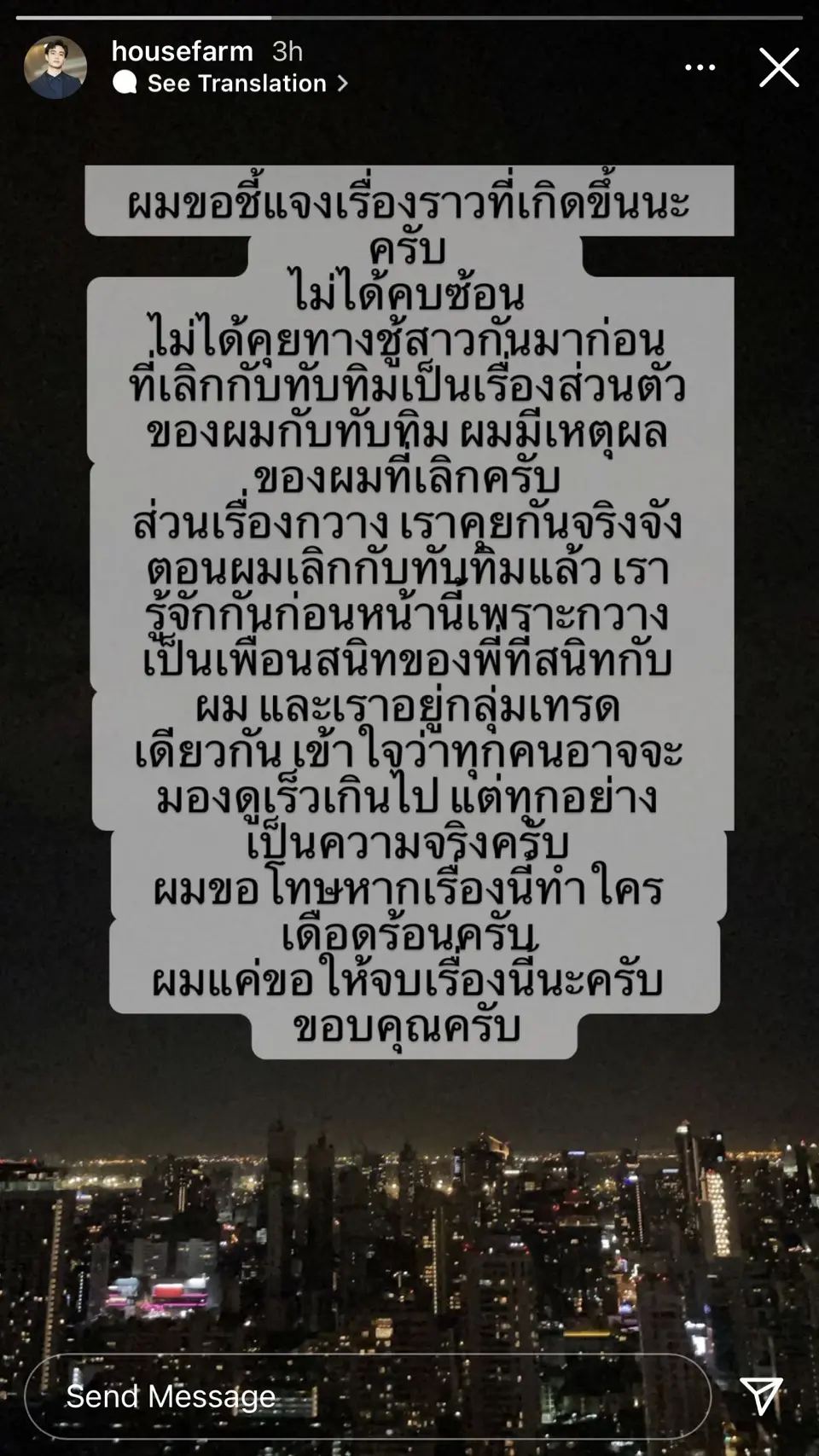 “ผมขอชี้แจงเรื่องราวที่เกิดขึ้นนะครับไม่ได้คบซ้อน ไม่ได้คุยทางชู้สาวกันมาก่อนที่เลิกกับทับทิมเป็นเรื่องส่วนตัวของผมกับทับทิม ผมมีเหตุผลของผมที่เลิกครับส่วนเรื่องกวาง เราคุยกันจริงจังตอนผมเลิกกับทับทิมแล้ว เรารู้จักกันก่อนหน้านี้เพราะกวางเป็นเพื่อนสนิทของพี่ที่สนิทกับผมและเราอยู่กลุ่มเทรดเดียวกันเข้าใจว่าทุกคนอาจจะมองดูเร็วเกินไป แต่ทุกอย่างเป็นความจริงครับผมขอโทษหากเรื่องนี้ทำใครผมแค่ขอให้จบเรื่องนี่นะครับเดือดร้อนครับขอบคุณครับ