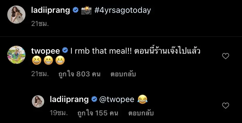 ล่าสุด เลดี้ปราง ได้มีการโพสต์ภาพในอดีตคู่กับ โต้ง ซึ่งเป็นภาพย้อนวันนี้เมื่อ 4 ปีที่แล้ว พร้อมแคปชั่นว่า #4yrsagotoday ซึ่งด้านแฟนหนุ่มก็ได้มีการเข้ามาคอมเมนต์ตอบกลับว่า I rmb that meal!! ตอนนี้ร้านเจ๊งไปแล้ว ทำเอาบรรดาแฟนๆของทั้งคู่ต่างเข้ามาแปะหัวใจใต้โพสต์กันเป็นจำนวนมาก