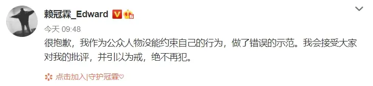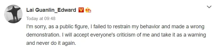 ล่าสุด ในวันที่ 24 พฤศจิกายน ควานลินได้ออกมาพูดขอโทษเกี่ยวกับเรื่องนี้ลงใน Weibo ส่วนตัวของตน โดยระบุว่า “ผมอยากจะขอโทษทุกคน โดยในฐานะบุคคลสาธารณะ ผมไม่มีความระมัดระวังต่อการกระทำของตนเอง และได้กระทำผิดไป ผมขอน้อมรับคำติตักเตือนจากทุกคน และผมจะไม่ทำผิดแบบเดิมซ้ำอีก” ทางด้านชาวเน็ตก็มีหลายเสียงลงความเห็นให้ควานลินไปทำกิจกรรมเพื่อสังคมเพื่อเป็นการลงโทษอีก้วย