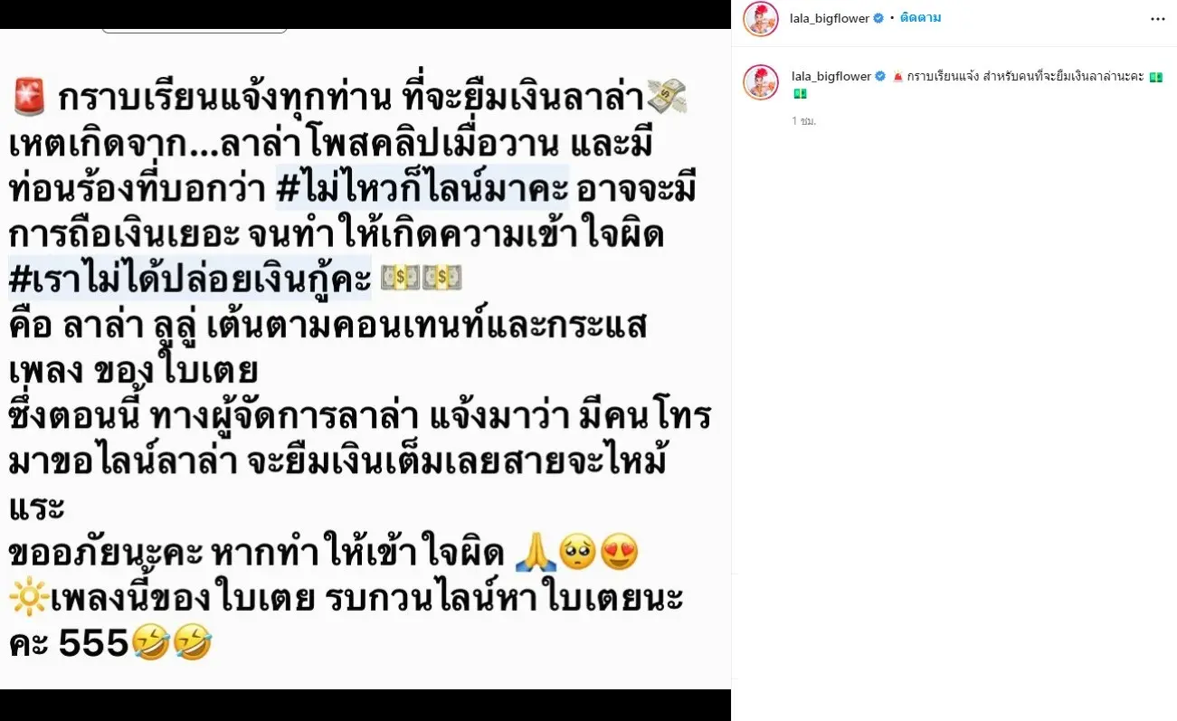 ล่าสุด (17 ก.พ. 65) ลาล่า อาร์สยาม ก็ได้ออกมาชี้แจงผ่านทางอินสตาแกรมแบบชัด ๆ ว่า ‘กราบเรียนแจ้งทุกท่านที่จะยืมเงินลาล่า เหตุเกิดจากลาล่าโพสต์คลิปเมื่อวาน และมีท่อนร้องที่บอกว่า ไม่ไหวก็ไลน์มาค่ะ อาจจะมีการถือเงินเยอะ จนทำให้เกิดความเข้าใจผิด เราไม่ได้ปล่อยเงินกู้ค่ะ คือ ลาล่า ลูลู่ เต้นตามคอนเทนต์ และกระแสเพลงของใบเตย ซึ่งตอนนี้ทางผู้จัดการลาล่าแจ้งมาว่า มีคนโทรมาขอไลน์ลาล่า จะยืมเงินเต็มเลย สายจะไหม้แล้ว ขออภัยนะคะ หากทำให้เข้าใจผิด เพลงนี้ของใบเตย รบกวนไลน์หาใบเตยนะคะ 555′