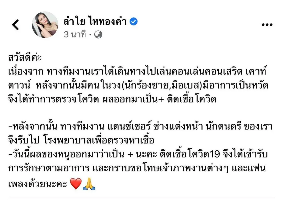 โควิด-19 กลับมาระบาดอีกระลอก คนบันเทิงก็ติดเชื้อกันไปหลายคน ล่าสุดลูกสาว “ลำไย ไหทองคำ” ก็เจอข่าวลือว่าติดเชื้อโควิด-19 หลังไปขึ้นคอนเสิร์ตช่วงปีใหม่ที่ผ่านมา