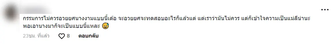 โดยคอมเมนต์จากแฟน ๆ ที่เข้ามาแสดงความคิดเห็นถึงโมเมนต์ดังกล่าวที่เกิดขึ้น มีทั้ง “มันคือจิตวิทยาของแม่ ว่าจะรับมือได้ไหม” หรือ “กรรมการไม่ควรอวยยศนางงามแบบนี้เด้อ จะอวยยศจะทดสอบอะไรก็แล้วแต่ แต่เราว่ามันไม่ควร แต่ก็เข้าใจความเป็นแม่ลีน่านะ พอเอานางมาก็จะเป็นแบบนี้แหละ” เป็นต้น