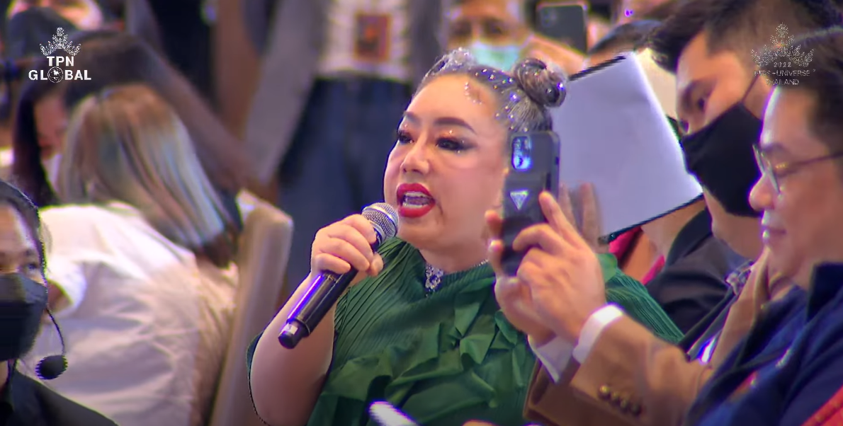 “โอปอล เธอเป็นคนไทยทำไมเธอไม่พูดภาษาไทย เธอไปดัดจริตพูดภาษาอังกฤษทำไม เธอรู้มั้ยว่าฉันฟังภาษาอังกฤษไม่รู้เรื่อง ประยุทธ์ก็ฟังไม่รู้เรื่อง คนไทย 70 ล้านคนก็มีประมาณ 65 ล้านคนฟังภาษาอังกฤษไม่ออก และเธออยากได้มงมั้ย เพราะเวทีนี้คนที่สมควรได้มงคือเธอ เพราะเธอสด เธอซิง พูดภาษาไทยได้มั้ย”