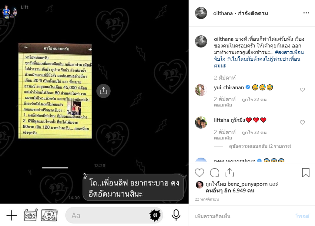 กลายเป็นที่ตลกขบขันไปเลยสำหรับเพื่อนคู่ซี้ อย่าง ลิฟท์ สุพจน์ และ ออยธนา ที่ล่าสุดเมื่อวันที่ 22 พ.ย. ที่ผ่านมา หนุ่ม ออยธนา โพสต์ข้อความสุดปั่นถึง ลิฟท์ สุพจน์ ที่ได้มีการพูดคุยกันเล่นๆว่า หนุ่มลิฟท์โดนภรรยาสุดที่รักให้เงินใช้เพียงวันละ 80 บาท โดยหนุ่มออย โพสต์ภาพแชท พร้อมแคปชั่นว่า “บางทีเพื่อนก็ทำได้แค่รับฟัง เรื่องของคนในครอบครัว ให้เค้าคุยกันเอง ออกมาทำงานเดวกูเลี้ยงข้าวนะ… #สงสารเพื่อนจับใจ #เไม่โดนกับตัวคงไม่รู้ห้ามขำเพื่อนผมนะ”