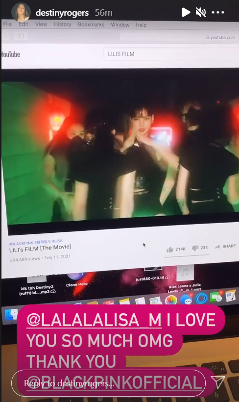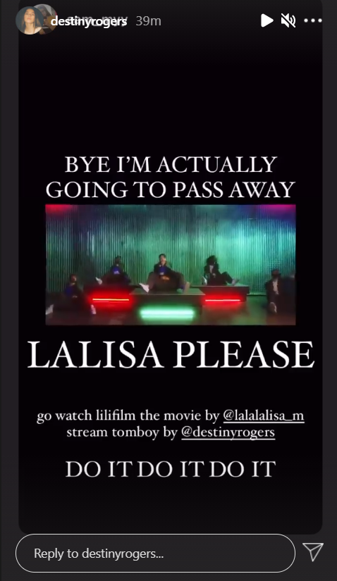 Destiny Rogers เองก็ได้ออกมาโพสต์แสดงความตื่นเต้นที่ลิซ่านำเพลงของเธอไปเต้น โดยเธอได้มาลงไอจีสตอรี่ ทั้งเขียนขอบคุณ และสนับสนุนผลงานของเธอ