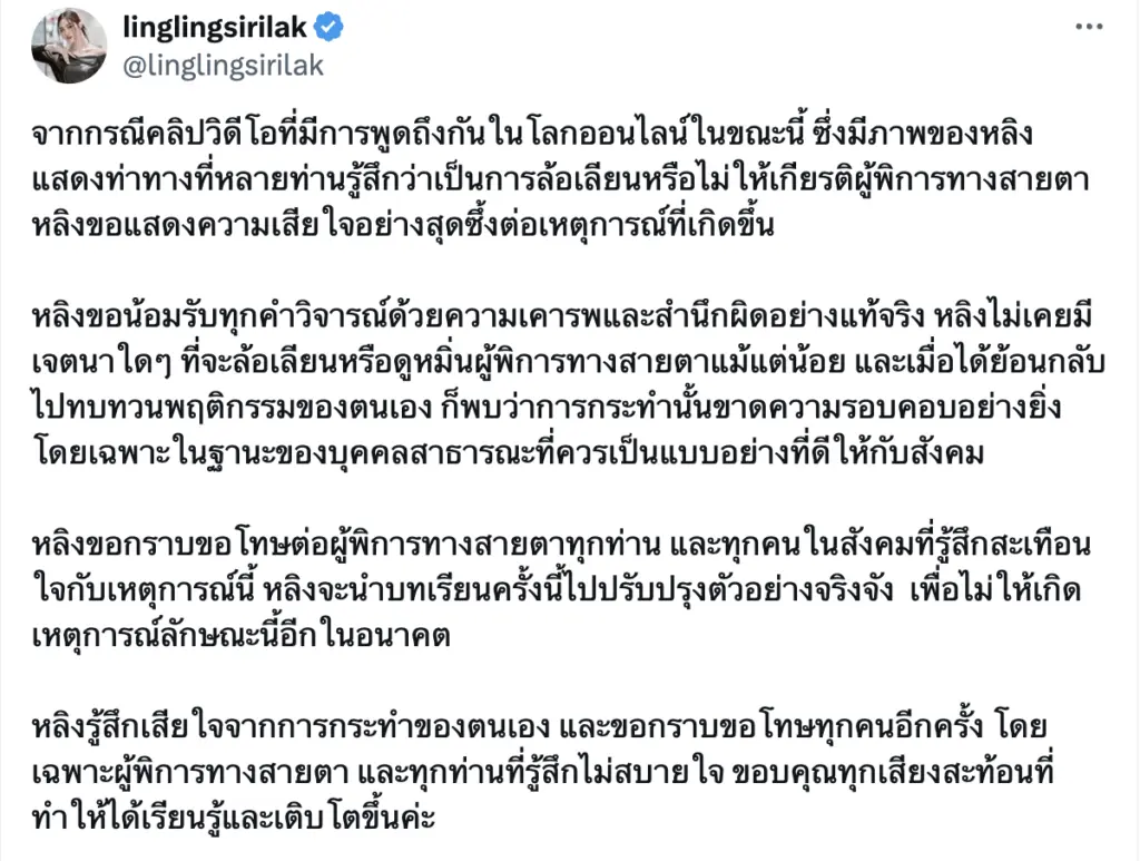 “จากกรณีคลิปวิดีโอที่มีการพูดถึงกันในโลกออนไลน์ในขณะนี้ ซึ่งมีภาพของหลิงแสดงท่าทางที่หลายท่านรู้สึกว่าเป็นการล้อเลียนหรือไม่ให้เกียรติผู้พิการทางสายตา หลิงขอแสดงความเสียใจอย่างสุดซึ้งต่อเหตุการณ์ที่เกิดขึ้น หลิงขอน้อมรับทุกคำวิจารณ์ด้วยความเคารพและสำนึกผิดอย่างแท้จริง หลิงไม่เคยมีเจตนาใดๆ ที่จะล้อเลียนหรือดูหมิ่นผู้พิการทางสายตาแม้แต่น้อย และเมื่อได้ย้อนกลับไปทบทวนพฤติกรรมของตนเอง ก็พบว่าการกระทำนั้นขาดความรอบคอบอย่างยิ่ง โดยเฉพาะในฐานะของบุคคลสาธารณะที่ควรเป็นแบบอย่างที่ดีให้กับสังคม หลิงขอกราบขอโทษต่อผู้พิการทางสายตาทุกท่าน และทุกคนในสังคมที่รู้สึกสะเทือนใจกับเหตุการณ์นี้ หลิงจะนำบทเรียนครั้งนี้ไปปรับปรุงตัวอย่างจริงจัง เพื่อไม่ให้เกิดเหตุการณ์ลักษณะนี้อีกในอนาคต หลิงรู้สึกเสียใจจากการกระทำของตนเอง และขอกราบขอโทษทุกคนอีกครั้ง โดยเฉพาะผู้พิการทางสายตา และทุกท่านที่รู้สึกไม่สบายใจ ขอบคุณทุกเสียงสะท้อนที่ทำให้ได้เรียนรู้และเติบโตขึ้นค่ะ”