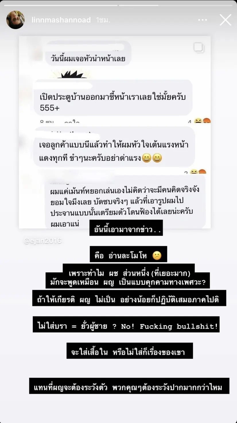 โดยในสตอรี่ล่าสุดของเจ้าตัว ได้มีการแชร์โพสต์จากไอจี Ejan2016 ที่พูดถึงกรณีของไรเดอร์คนดังกล่าวด้วยเช่นกัน พร้อมกับเขียนข้อความระบายถึงความไม่พอใจที่ ผู้หญิงต้องถูกพูดจาคุกคามทางเพศอยู่เรื่อยๆ เจ้าตัวยังบอกว่า ถึงแม้จะไม่ใช่ผู้ชายทั้งหมดที่เป็นแบบนี้ ก็มีอยู่ไม่น้อยในสังคม ถ้าจะให้เกียรติผู้หญิงไม่ได้ ก็ให้ปฏิบัติอย่างเสมอภาคกัน ผู้หญิงไม่ใส่บรา ไม่ได้ = ยั่วผู้ชายเสมอไป พร้อมทั้งบอกว่าผู้หญิงจะใส่หรือไม่ใส่ก็เป็นเรื่องของเขา แทนที่ผู้หญิงจะต้องระวัง พวกผู้ชายต้องระวังปากมากกว่า!