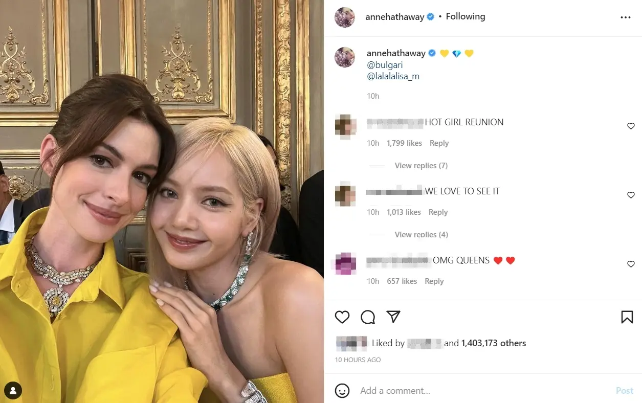 กลายเป็นอีกหนึ่งปรากฏการณ์ที่ทำเอาแฟน ๆ ของทั้งสองต่างชอบใจไม่น้อยเลยทีเดียว หลังจากที่ก่อนหน้านี้ แอนน์ แฮททาเวย์ และ ลิซ่า Blackpink ได้เดินทางไปร่วมงาน Bulgari Eden The Garden of Wonders จากแบรนด์ Bulgari ถึงเมืองปารีส ประเทศฝรั่งเศส ในฐานะ Global Ambassador