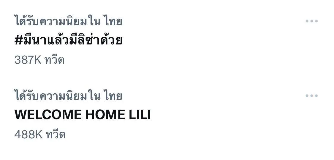 ดังนั้นแฟนๆของลิซ่าจำนวนมากที่เก็บความดีใจเอาไว้ไม่อยู่ จึงมารวมตัวกับที่ทวิตเตอร์เพื่อต้อนรับน้องกลับสู่บ้านเกิดอย่างอบอุ่น จนแท็ก #มีนาแล้วมีลิซ่าด้วย และ #WELCOMEHOMELILI ติดเทรนด์ร้อนในทวิตเตอร์เลยทีเดียว