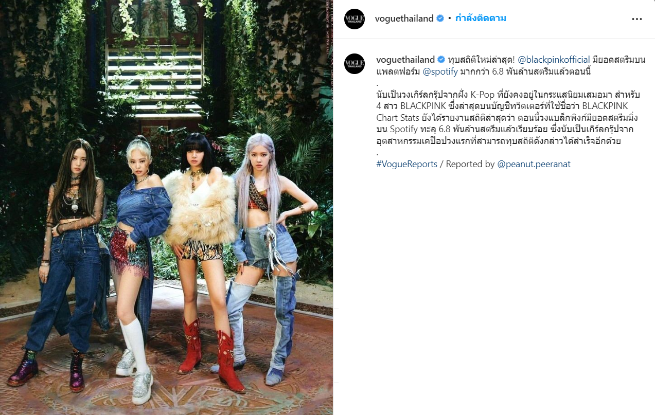นอกจากนี้ อินสตาแกรมของ VOGUE ประเทศไทย ยังได้ประกาศศักดาความปังของ 4 สาว BLACKPINK กับการทุบสถิติใหม่ล่าสุดบน Spotify อีกด้วย โดยในรายละเอียดระบุว่า ‘ทุบสถิติใหม่ล่าสุด แบล็กพิงก์ มียอดสตรีมบนแพลตฟอร์ม Spotify มากกว่า 6.8 พันล้านสตรีมแล้ว’