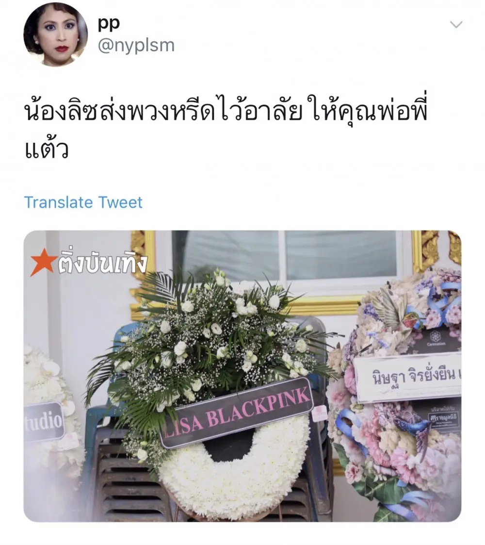 ล่าสุด ติ่งบันเทิง ได้เผยภาพพวงหรีด ที่ ลิซ่า Blackpink ส่งมาเผื่อแสดงความไว้อาลัยแก่การจากไปของ พลอากาศตรีณรงค์ คุณพ่อของ แต้ว ณฐพร ซึ่งถือเป็นอีกหนึ่งคนบันเทิงที่ร่วมแสดงความอาลัยและให้กำลังใจแต้งกันอย่างล้นหลาม