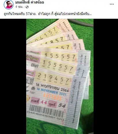 จากที่ก่อนหน้านี้นักร้องลูกทุ่งดังอย่าง มนต์สิทธิ์ คำสร้อย เพิ่งจะออกมาให้เลขเด็ดกันแบบไม่หมกเม็ด โดยเจ้าตัวได้โพสต์ภาพโชว์ลอตเตอรี่พร้อมกับแคปชั่นว่า มาเเล้วครับเลขพ่อน้ำสอง หอบหิ้วล็อตเตอรี่พร้อมปฎิทินปี2565 ข้างในมีเลขประจำวันด้วยนะครับ. งวดนี้. ตรงกันกับเลขที่ผมชอบ 54-74-57-70 โปรดใช้วิจารณญาณในการชม โชคดีเฮงๆรวยๆกันนะครับ
