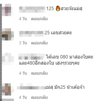 อย่างไรก็ตามก็ได้มีเหล่าคอหวยเข้ามาเมนต์กันจำนวนมากถึงเลขที่เธอซื้อไว้ไปในทางเดียวกันว่า 80 , 25 .125