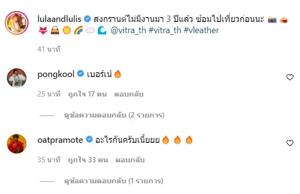 มาพร้อมกับแคปชั่นว่า สงกรานต์ไม่มีงานมา 3 ปีแล้ว ซ้อมไปเที่ยวก่อนนะ 📸👒👙👜☀️🌈☁️🌊 ทำเอาแฟนๆกดหัวใจกันแบบรัว ๆ รวมถึงเพื่อนซี้อย่าง ป๊อป ปองกูล และ โอ๊ต ปราโมทย์ ก็ยังอดใจไม่ไหวเข้ามาคอมเมนต์แซวอีกด้วย