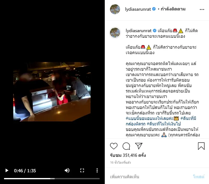 ลิเดีย ศรัณย์รัชต์ เรียกว่าเป็นอุทาหรณ์สอนใจให้แก่ผู้ใช้รถใช้ถนน ว่าควรมีกล้องติดรถเอาไว้กันมิจฉาชีพหรือคนผิดมาเรียกร้องค่าเสียหาย