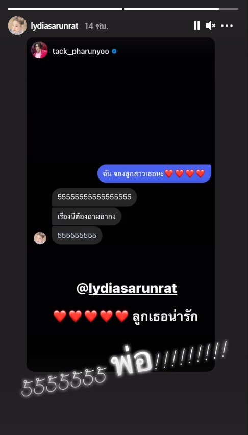 ซึ่งหนุ่มแทคก็ได้แคปบทสนทนาลงไอจีสตอรี่และเขียนแคปชั่นต่อว่า “ลูกเธอน่ารัก” ซึ่งสาวลีเดียก็ได้โควทสตอรี่มาพร้อมลั่นแคปชั่นว่า “55555555 พ่อ !!!!!!!!!!” เลยทีเดียว