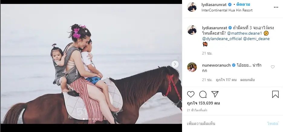 ล่าสุดทั้งครอบครัวได้พากัไนปเที่ยวเล่นพร้อมมขี่ม้าริมทะเล งานนี้สาวลีเดียเลยได้โอกาสพาสองแสขี่ม้าไปด้วยกัน แต่ที่ทำให้คุณพ่อแทธิวต้องแอบยิ้มก็คงเป็นประโยคที่ว่าลีเดียนั้นโพสต์รูปของเธอพร้อมลูกๆด้วยแคปชั่นว่า “ถ้ามีคนที่ 3 จะเอาไว้ตรงไหนดีคะสามี? “