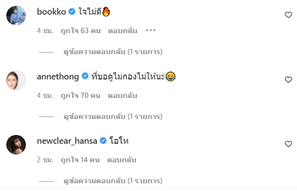 แต่งานนี้ยิ่งกว่าการกดหัวใจแล้วทำเอาหลายคนก็อดคอมเมนต์ไม่ไหว เพราะนานๆทีจะได้เห็นหนุ่มมีนถอดเสื้อโชว์หุ่นแซ่บแบบนี้ รวมถึงคนในวงการบันเทิงก็แห่แซวเพียบ อาทิ ดีเจ บุ๊คโกะ , นิวเคลียร์ รวมถึงตัวแม่อย่าง แอน ทองประสม ก็เข้ามาคอมเมนต์ด้วย แหม๋…ก็นานทีปีหนลงแบบนี้ มีแซวกันเป็นเรื่องปกติ เพราะหุ่นกีมาก