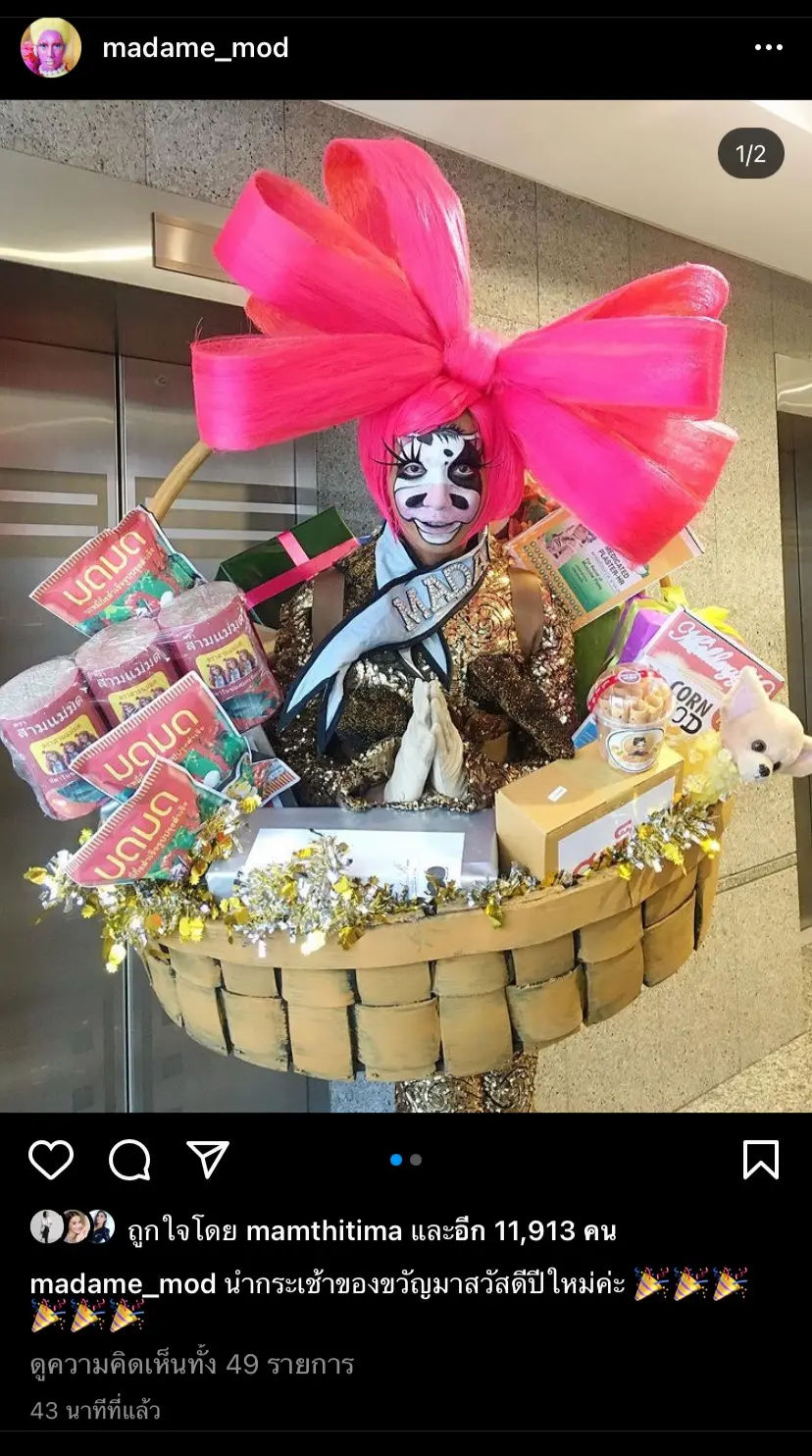 เรื่องความปัง !! ต้องยกให้จริงๆสำหรับ มาดามมด ที่ไม่ว่าจะสร้างสรรค์ผลงานอะไรออกมา ก็เลิศไม่ไหว งานนี้งานเเซ่บ งานชนะเลิศต้องยกให้จริงๆจ้าาา ล่าสุดเจ้าตัวออกมาโพสต์ภาพส่งท้ายปี พร้อมกับชุดสุดครีเอทีฟ เป็นชุดของขวัญปีใหม่ที่เก๋เเละอลังการไม่เหมือนใครเลยจริงๆ ซึ่งงานนี้เจ้าตัวออกมาโพสต์ภาพผ่านอินสตาแกรมส่วนตัว พร้อมกับแคปชั่นว่า “นำกระเช้าของขวัญมาสวัสดีปีใหม่ค่ะ” งานนี้ทำเอาเหล่าบรรดาชาวเน็ตเข้ามาคอมเมนต์ชื่นชมในความอลังการกันอย่างล้มหลาม