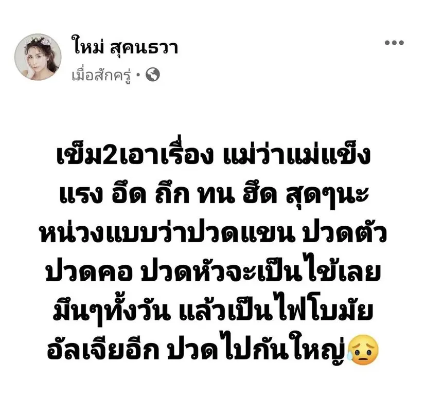 ล่าสุด เจ้าตัวได้มีการออกมาเคลื่อนไหว ด้วยการอัปเดทอาการหลังฉีดวัคซีนเข็มที่ 2 ว่า “เข็ม 2 เอาเรื่อง แม่ว่าแม่แข็งแรง อึด ถึก ทน ฮึด สุดๆนะ หน่วงแบบว่าปวดแขน ปวดตัว ปวดคอ ปวดหัวจะเป็นไข้เลย มึนๆทั้งวัน แล้วเป็นไฟโบรมัยอัลเจียอีก ปวดไปกันใหญ่…”