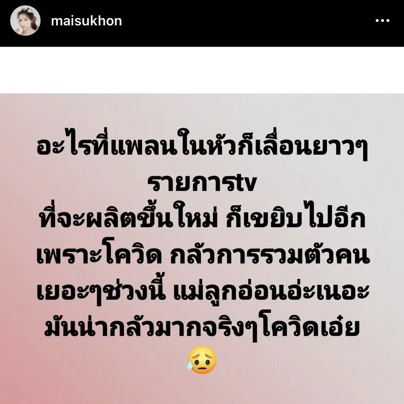 ก่อนหน้านี้คุณแม่คนสวย ใหม่ สุคนธวา ได้มีการออกมาโพสต์ถึงสถานการณ์โควิด19 ว่า “อะไรที่แพลนในหัวก็เลื่อนยาวๆ รายการ tv ที่จะผลิตขึ้นใหม่ ก็เขยิบไปอีกเพราะโควิด กลัวการรวมตัวคนเยอะๆช่วงนี้ แม่ลูกอ่อนอ่ะเนอะมันน่ากลัวมากจริงๆโควิดเอ๋ย”