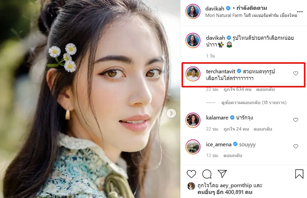 ล่าสุด สาวใหม่ก็ได้ลงรูปอวดความสวยกันไปในไอจี พร้อมขอความช่วยเหลือจากชาวเน็ตให้ช่วยเลือกรูปหน่อย เพราะเธอเลือกไม่ได้จริงๆ โดยโพสต์ว่า “รูปไหนดีช่วยดาวิเลือกหน่อยน้าาา✨ ?” แต่งานนี้ หนุ่มเต๋อดันขอโผล่มาหยอดหวานใส่แฟนสาวเสียหน่อย มาคอมเมนต์ตอบกลับว่า “สวยหมดทุกรูป เลือกไม่ได้คร่าาาาาาา”