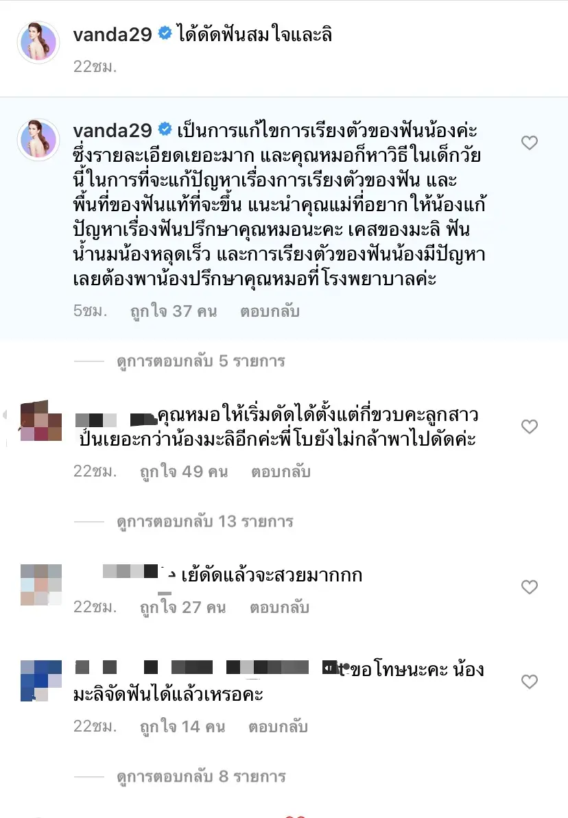 กลายเป็นเรื่องที่ถกเถียงกันบนโลกออนไลน์ เมื่อแม่ โบว์ แวนด้า ได้โพสต์ภาพลูกสาว น้องมะลิ ได้เริ่มทำการจัดฟันแล้ว ทั้งนี้ก็เกิดคำถามจากเหล่าชาวเน็ตได้เข้ามาถามกันยกใหญ่ว่า เด็ก 6 ขวบ เริ่มจัดฟันแล้วหรือ? ทั้งนี้แม่โบว์เองก็ได้เข้ามาคอมเมนต์ชี้แจงในโพสต์