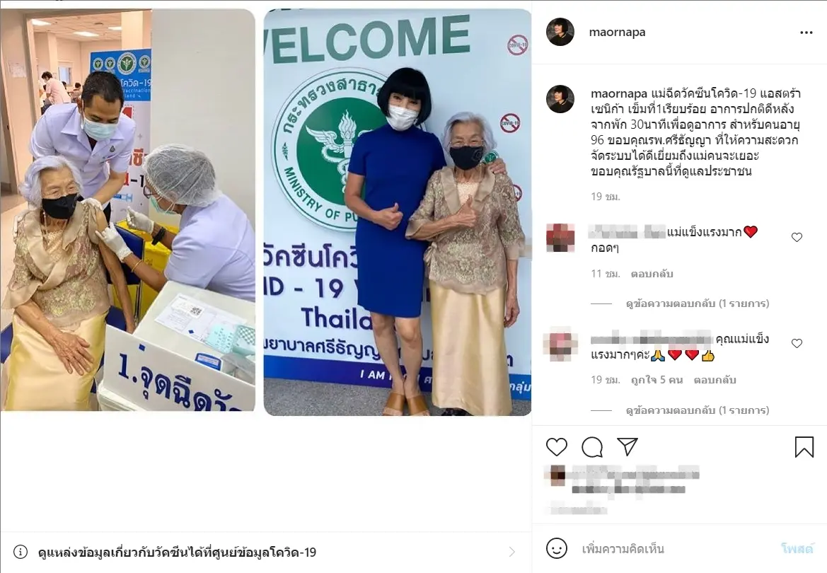 ทั้งนี้ภาพล่าสุดที่ม้าโพสต์ก็คือคุณแม่ในวัย 96 ปี ที่เข้ารับการฉีดวัคซีนวัคซีนซึ่ง ม้า อรนภา ก็ได้ระบุแคปชั่น