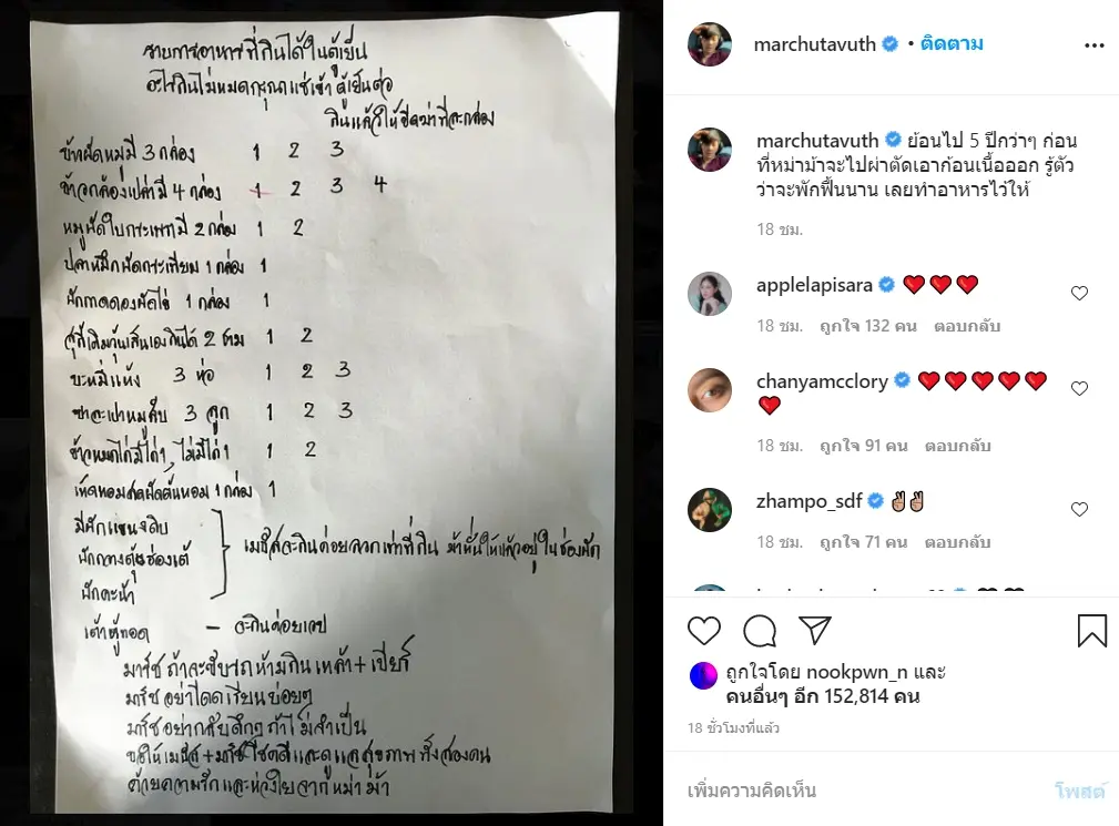 ล่าสุด หนุ่มมาร์ชก็ได้มาโพสต์รูปทั้งเศร้า และซึ้งในความรักของคุณแม่อีกครั้ง โดยได้มาโพสต์รูปกระดาษโน๊ตที่คุณแม่เคยเขียนเอาไว้ให้ พร้อมกับแคปชั่นว่า “ย้อนไป 5 ปีกว่าๆ ก่อนที่หม่าม้าจะไปผ่าตัดเอาก้อนเนื้อออก รู้ตัวว่าจะพักฟื้นนาน เลยทำอาหารไว้ให้” ซึ่งในกระดาษนั้นได้เขียนรายชื่ออาหารที่คุณแม่ได้ทำเอาไว้ให้ครอบครัวทานในช่วงที่คุณแม่ต้องไปรักษาตัว พร้อมกับเขียนข้อความสุดซึ้งที่ด้านล่างไว้ว่า “ขอให้เมธัส+มาร์ช โชคดี และดูแลสุขภาพทั้งสองคน ด้วยความรัก และห่วงใยจากหม่าม้า”