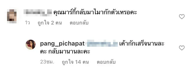 ซึ่งทางด้านของ แพง ภิชาภัช หนึ่งในคนที่ไปร่วมงานแต่งงานของพะเพื่อนด้วย ก็ได้มีการถ่ายรูปคู่กับบ่าวสาวและก็มาร์กี้ จนมีคนเข้าไปคอมเมนต์ถามใต้โพสต์นั้นว่า “คุณมาร์กี้กลับมาไม่กักตัวเหรอคะ” ทำให้ทางด้านของ แพง เองก็รีบเข้าไปคำถามแทนว่า มาร์กี้กักตัวเสร็จนานแล้ว กลับมาถึงประเทศไทยนานแล้ว