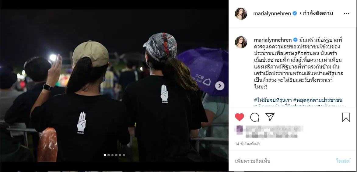 ล่าสุดเมื่อวันที่ 20 กันยายน หลังจากที่มารีญาได้เข้าร่วมม็อบ 19 กันายนแล้วนั้น เธอก็ได้ออกมาโพสต์ข้อความผ่านอินสตาแกรม ซึ่งเป็นข้อความที่ถามถึงรัฐบาล