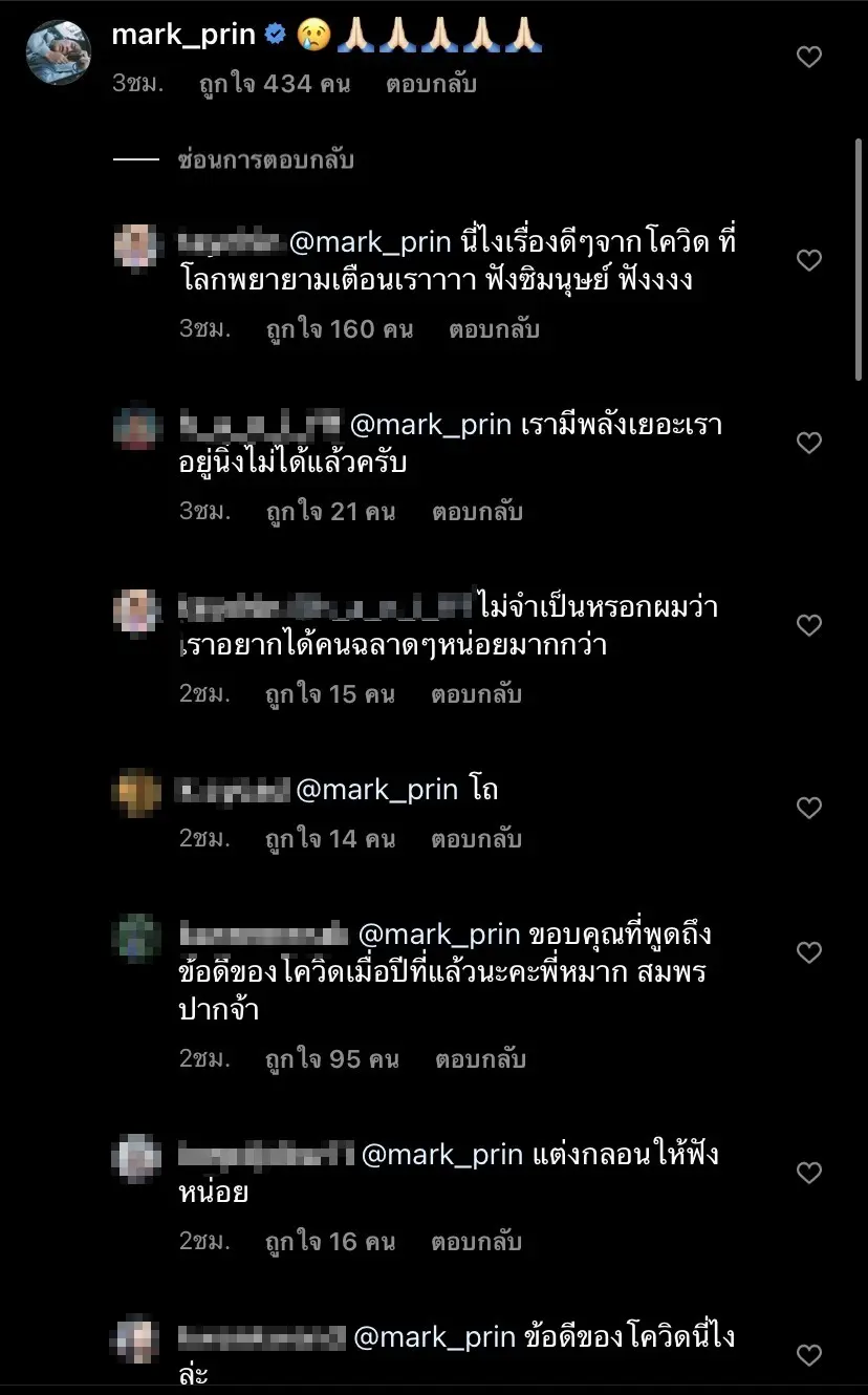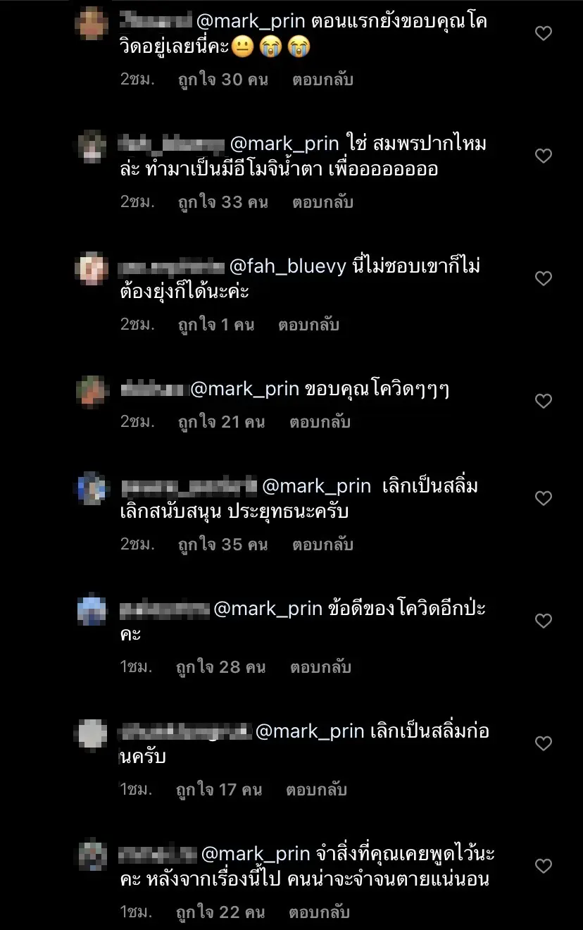 ทำเอาบรรดานักแสดงต่างเข้ามาคอมเมนต์ส่งกำลังใจให้เป็นจำนวนมาก รวมถึงพระเอกหนุ่มหล่อของช่อง 3 อย่าง หมาก ปริญ ที่ได้มีการเข้าไปส่งอิโมจิเพื่อเป็นกำลังใจให้ด้วยเช่นกัน แต่งานนี้กลับทำเอาบรรดาชาวเน็ตต่างเข้าไปแซะหนุ่มหมากกันอย่างมากมาย