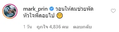 ล่าสุดสาวคิมได้โพสต์ภาพพร้อมแคปชั่น ” Still in Chiangmai ? @mark_prin ” หนุ่มหมากจึงเข้ามาตอบว่า ” วอนให้ลมช่วยพัดหัวใจพี่ลอยไป ? ”
