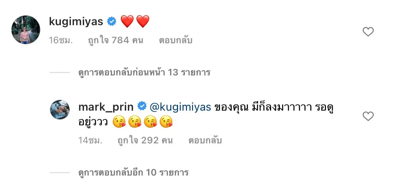 ด้านพระเอกหนุ่ม ณเดชน์ คูกิมิยะ ก็กดใจไม่ไหวเข้ามาคอมเมนต์แซวด้วยเช่นกัน โดยเขียนข้อความเป็นอิโมจิรูปหัวใจสีแดง ด้านหนุ่มหมากตอบหลับว่า ของคุณมี ก็ลงมา รอดูอยู่ พร้อมกับอิโมจิแสดงอารมณ์กำลังจุ๊บหัวใจ