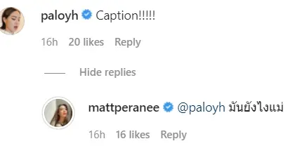 ทั้งนี้เธอได้ออกมาเขียนแคปชั่นเด็ดไว้ว่า จะมีรักก็เจ็บปวด จะหนีไปบวชก็จำบทสวดไม่ได้ ทำเอาแฟนคลับต่างชอบใจ และเรียกเสียงฮาได้ไม่น้อย ทันใดนั้น พลอย หอวัง ก็ได้เข้ามาคอมเมนต์ในไอจีของเธออย่างทันทีว่า แคปชั่น!!! ซึ่งสาวแมท ก็ตอบกลับไปอีกหนึ่งยกว่า มันยังไงแม่