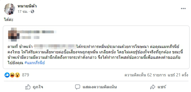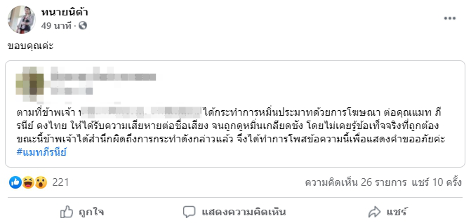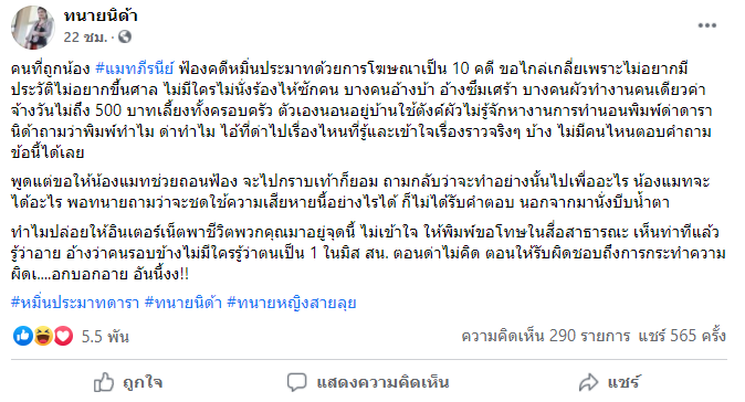 ก่อนที่ทนายนิด้าจะได้แชร์โพสต์ที่คนคอมเมนท์ว่าร้ายสาวแมทต่อ พร้อมแคปชั่น “ขอบคุณค่ะ”, “ได้ค่ะ”
