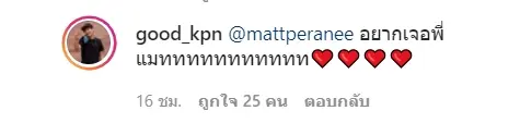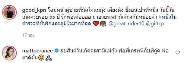 ไม่เพียงเท่านี้ สาวแมท ยังได้มีการไปคอมเมนต์อวยพรวันเกิดคุณพ่อของ เกรท วรินทร ต่ออีกว่า สุขสันต์วันเกิดค่ะสามีแม่กุ้ง พ่อพี่เกรทพี่กิ้บพี่กู้ดพ่อตาดิชั้น ทำเอา หนุ่มกู๊ด ถึงกับตอบทันทีว่า อยากเจอพี่แมททททททททททท