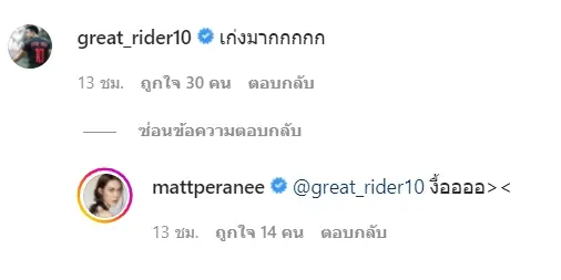 งานนี้ทำเอาพระเอกหนุ่ม เกรท วรินทร ไม่อยู่เฉย รีบเข้ามาคอมเมนต์ทันทีว่า เก่งมากกกกก ซึ่งสาวแมท ก็ได้มีการตอบกลับว่า งื้ออออ><
